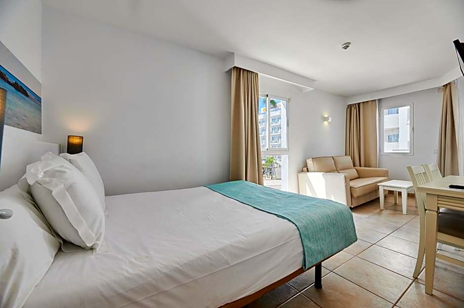 STUDIO WITH BALCONY 1 ADULT + 1 CHILD is 269 square feet and includes a double bed 131-150 width plus living room, balcony, satellite tv , hairdryer, and safe.